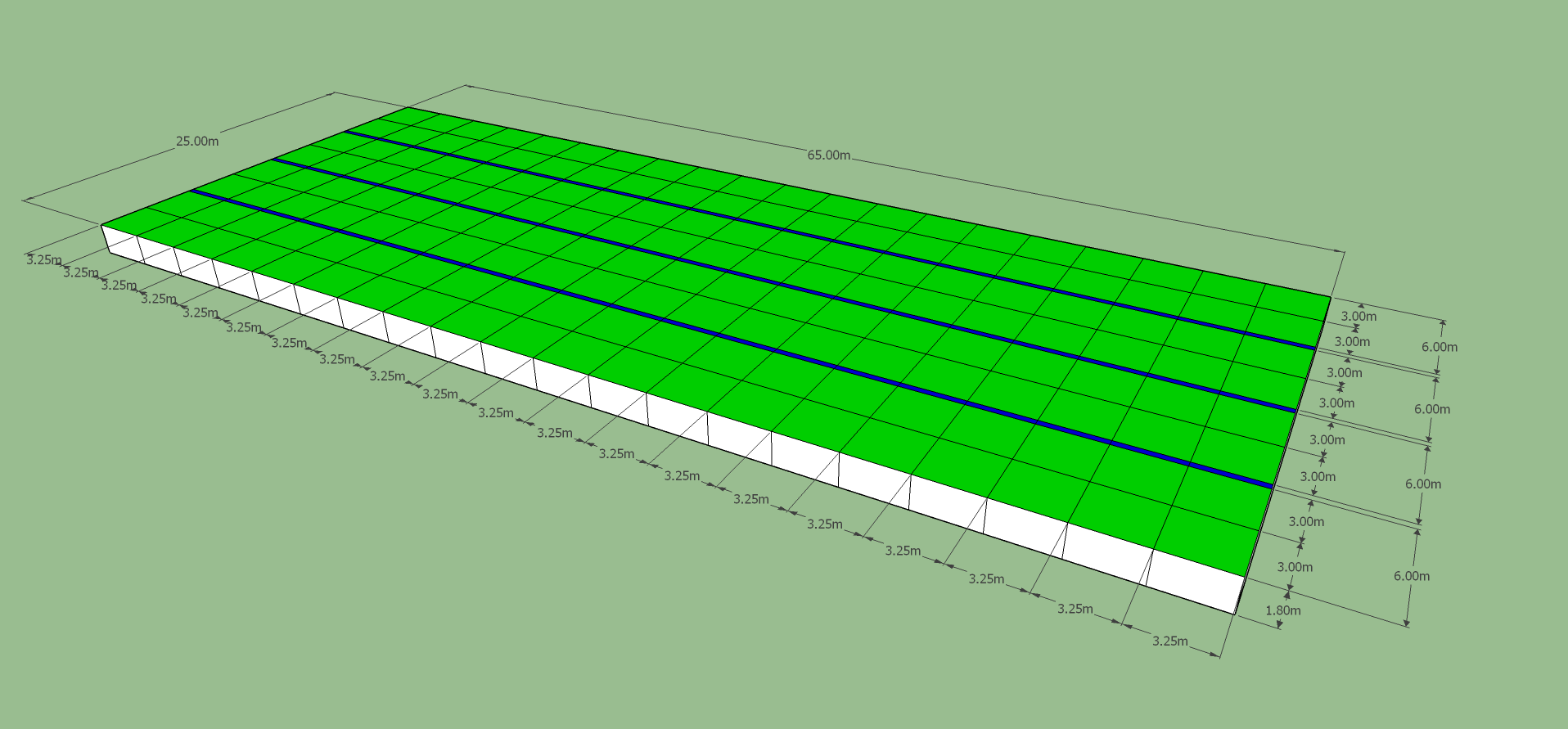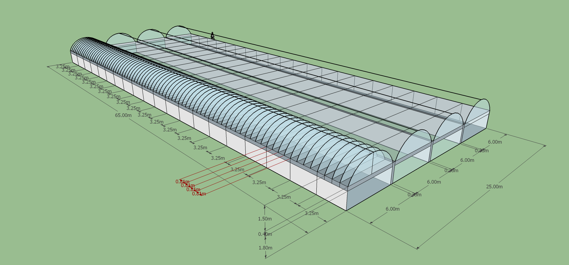 连栋大棚总长65米,总宽25米。单栋大棚宽6米,长65米,肩高2.2米,拱高1.5米,顶高3.7米,大棚之间用镀锌钢架水槽(天沟)相连,中间相比两端高10cm,天沟两端安装落水管排水。在1.8m高处利用学校提供的脚手架东西向将立柱(间距3.25m)连成一体,并在每个棚架中央(3m处)南北向连成一体,间隔25cm南北向拉塑钢绳形成棚面,棚顶覆盖PO膜,在连栋大棚中间安装6套链条式卷膜器和卷膜杆(下部配套约30cm的棚膜对接),达到通风透气功能。