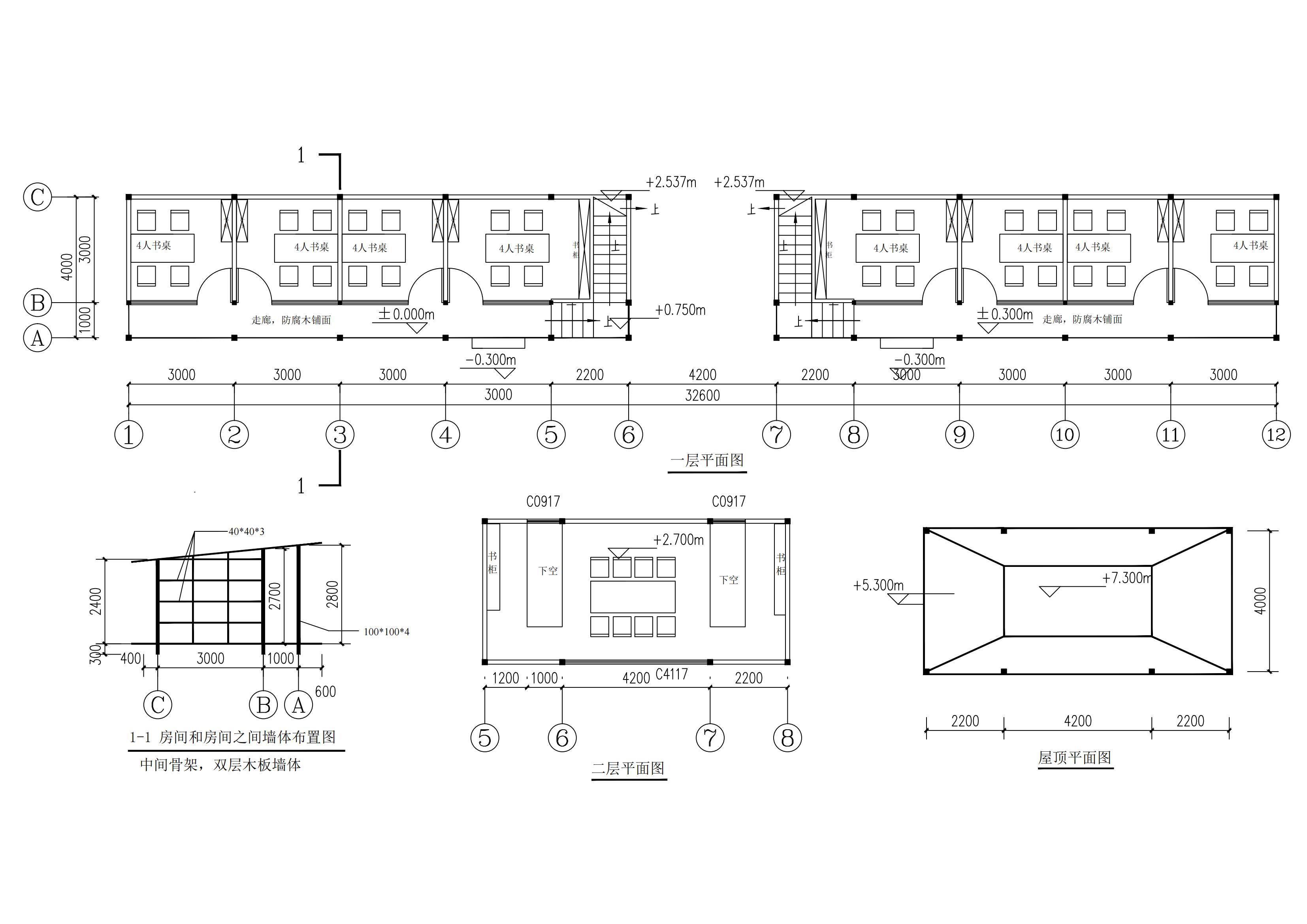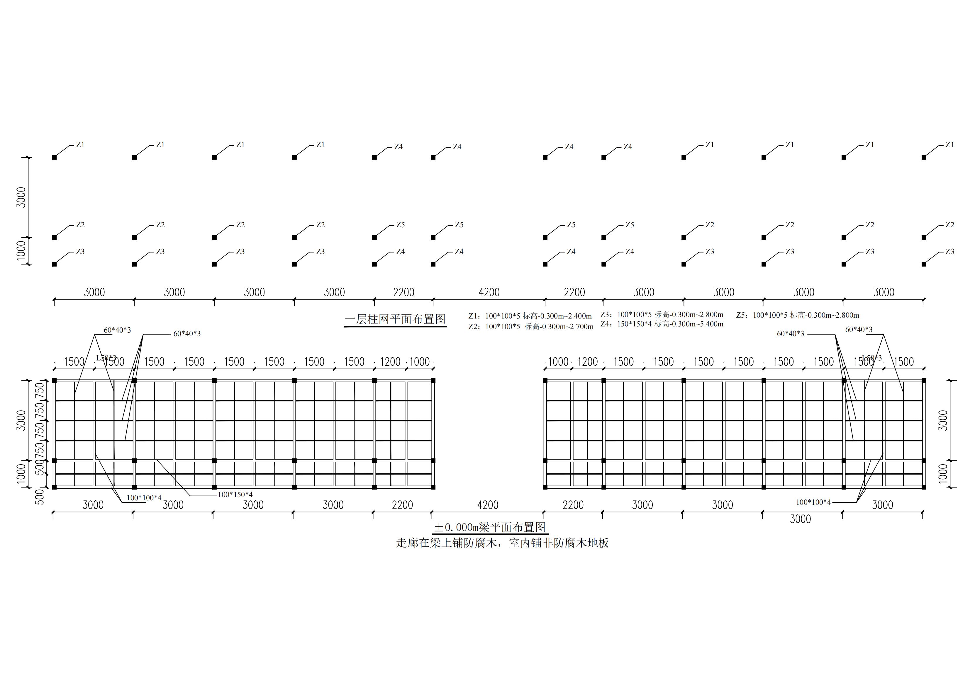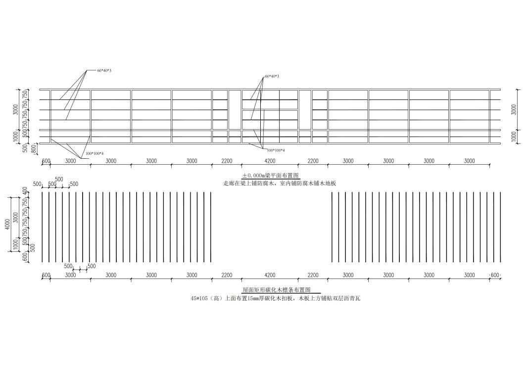 3.八间书屋外走廊地面高于室外地面约30cm,外走廊钢结构骨架上铺防腐木40mm*40mm*4000mm,室内钢结构骨架上防腐木40mm*40mm*4000mm,再铺12mm厚复合木地板。8间书屋地面钢结构骨架主龙骨100*100*4和100*150*4,次龙骨60*40*3。