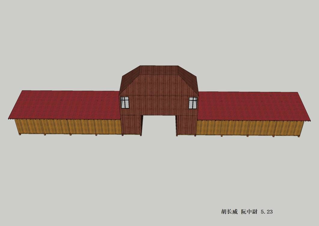7.中间的门楼(二层)地面与8间木屋地面一致,屋面骨架上铺12mm欧松板板,木板上铺油毡防水后,铺10mm碳化木扣板。