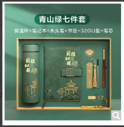 2.纪念品套装组成:保温杯、笔记本、木头笔、书签、32GU盘、笔芯、书夹。