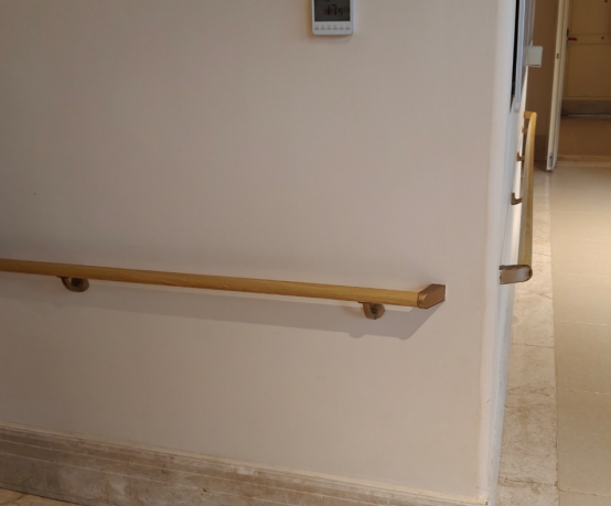 2.外走道单扶手数量:总长度约6500米,深棕色,38*3mm无缝钢管焊接,外走廊栏杆对侧墙面安装,与走廊栏杆平行,颜色一致(详见下图)。