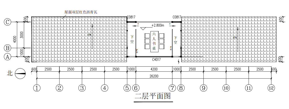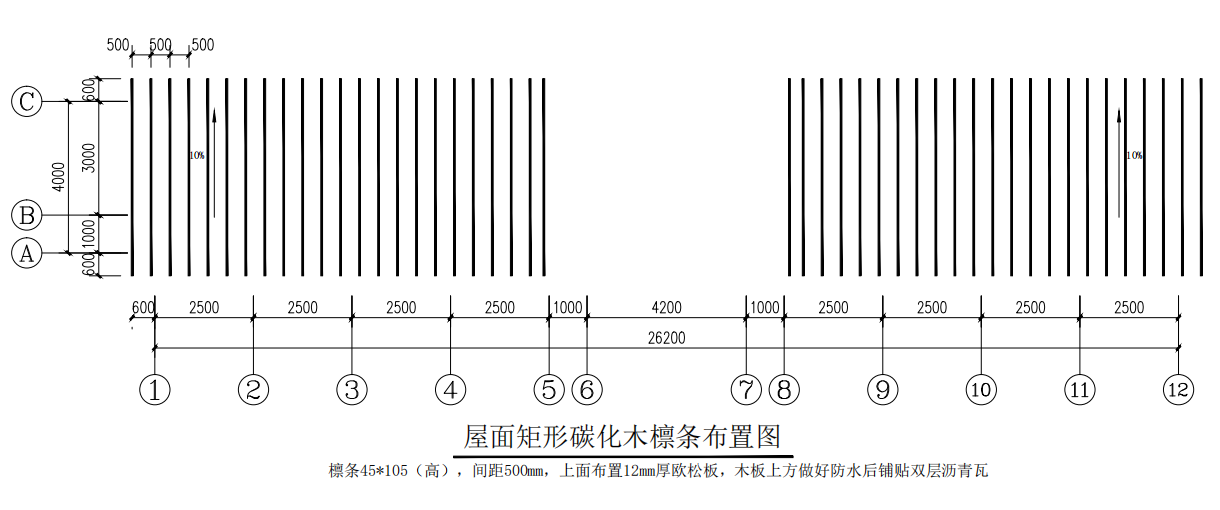 4.8间书屋天面钢结构骨架主龙骨100*100*4,次龙骨60*40*3;骨架上布置间距500mm的碳化木檩条45*105*4000,檩条上方铺12mm欧松板板,木板上铺一层防水材料后,铺双层红色沥青瓦。