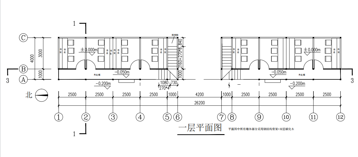 1. 整体结构采用混凝土基础梁+上部钢结构形式。投标方只负责室内地面以上部分,包括钢结构骨架、墙体骨架及碳化木包面、屋面碳化木檩条及欧松板、沥青瓦。