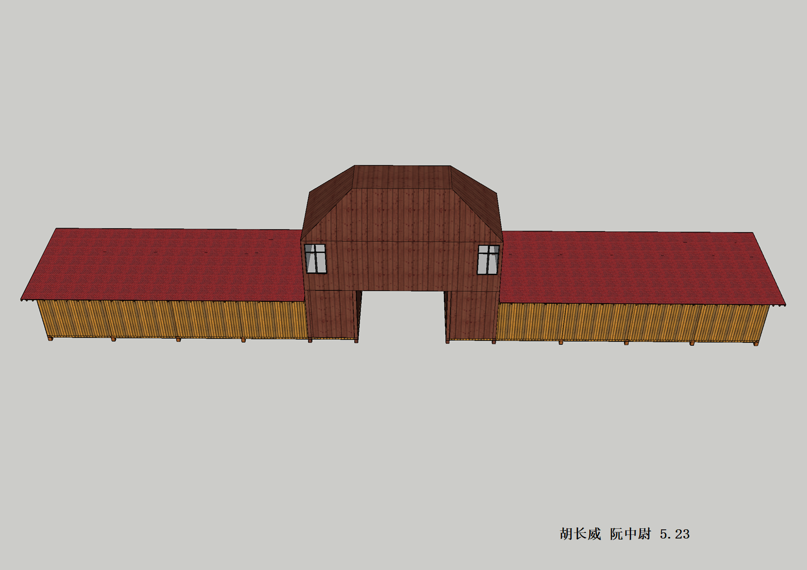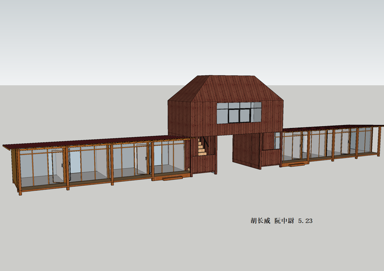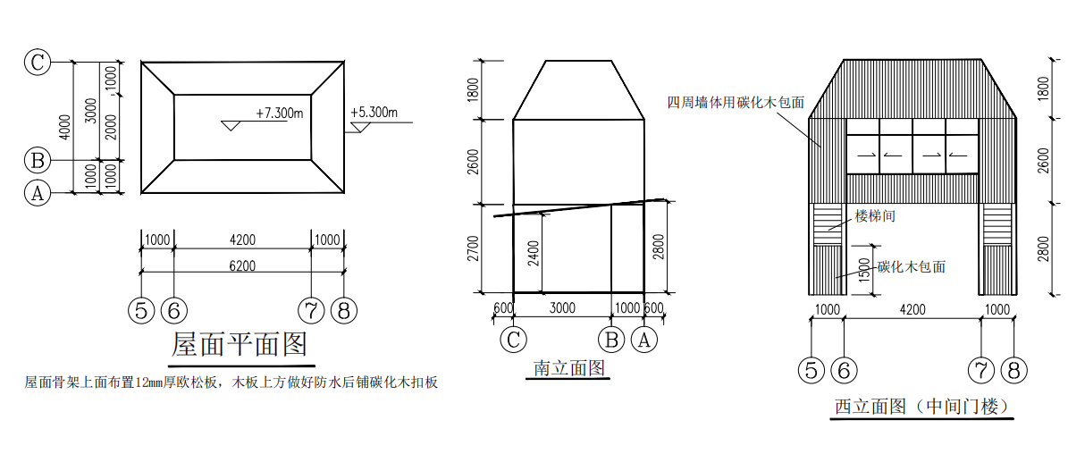 5.8间书屋西立面采用玻璃墙体和地簧玻璃门,采用12mm钢化玻璃。8间书屋东侧墙体以及最南、最北两侧墙体钢骨架外铺10mm碳化木扣板。中间门楼屋面钢结构骨架上12mm欧松板板,木板上铺一层防水材料后,铺碳化木扣板。中间门楼四面墙体钢骨架外铺碳化木扣板。