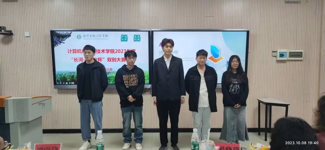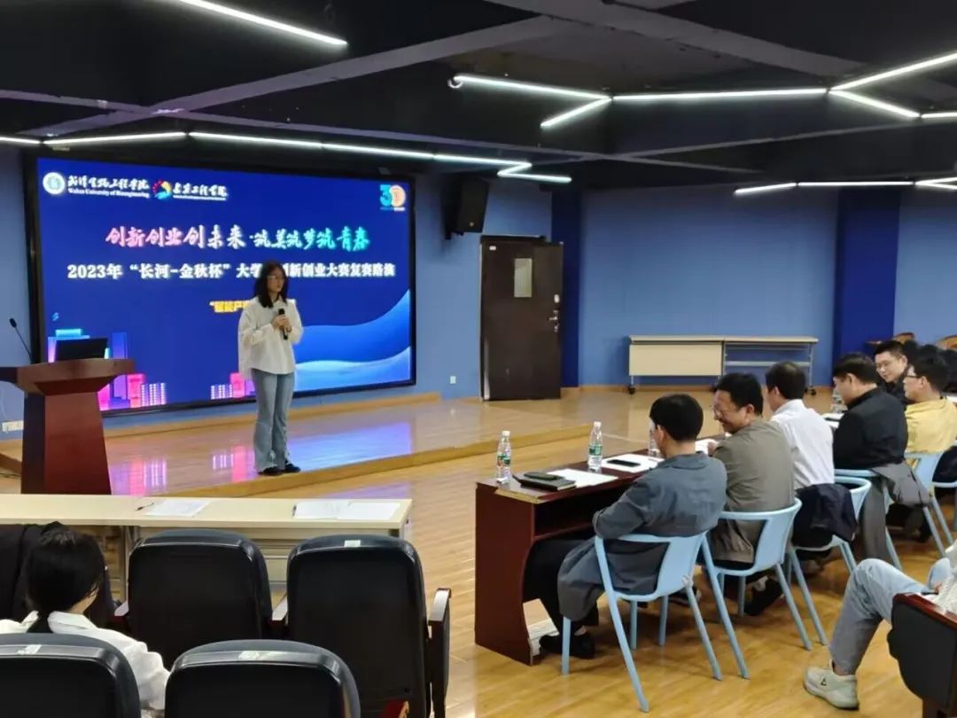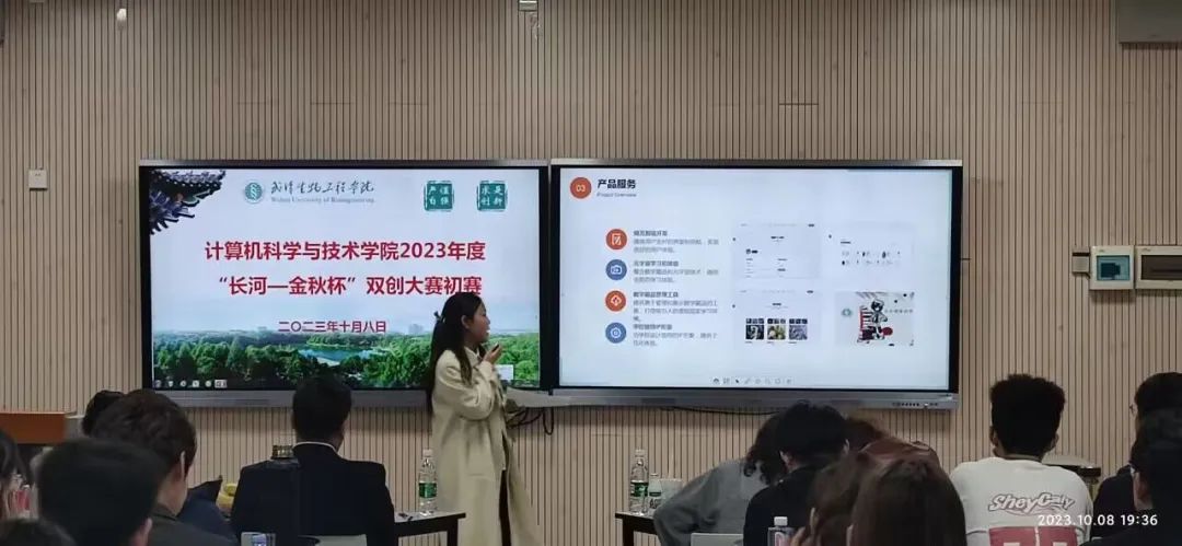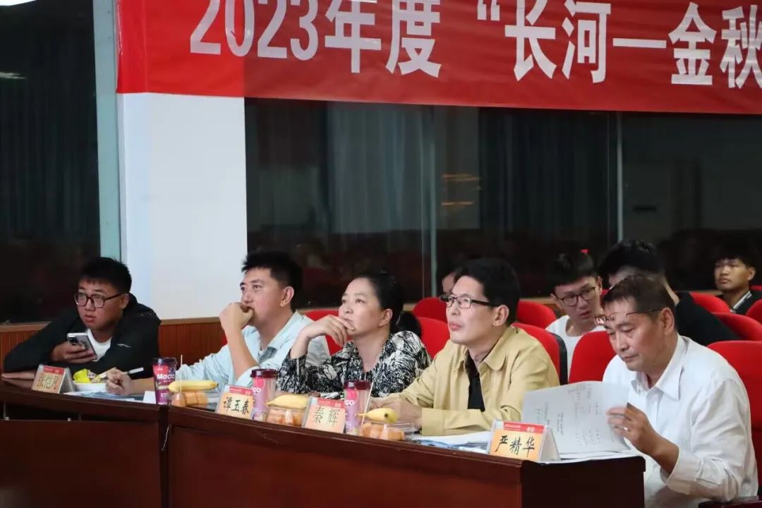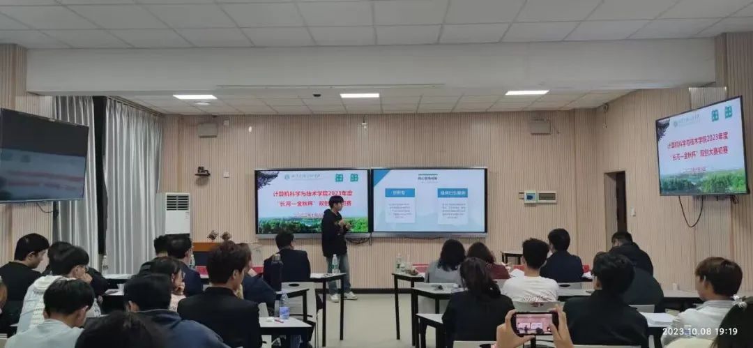 计算机科学与技术学院在8304智慧教室举行学院2023年“长河-金秋杯”决赛。教务处处长刘春侠、后勤集团党总支书记刘中兵、党委宣传部常务副部长·新媒体中心主任程晓璐等职能部门领导及学院党政班子成员担任评委。并邀请学院双创学子典型唐长春、王志等学生现场指导。经过通讯评审遴选的18个项目按照赛道依次路演答辩,各评委细致聆听,并悉心指导,对每个项目的策划书、PPT以及路演技巧等提出修改建议。