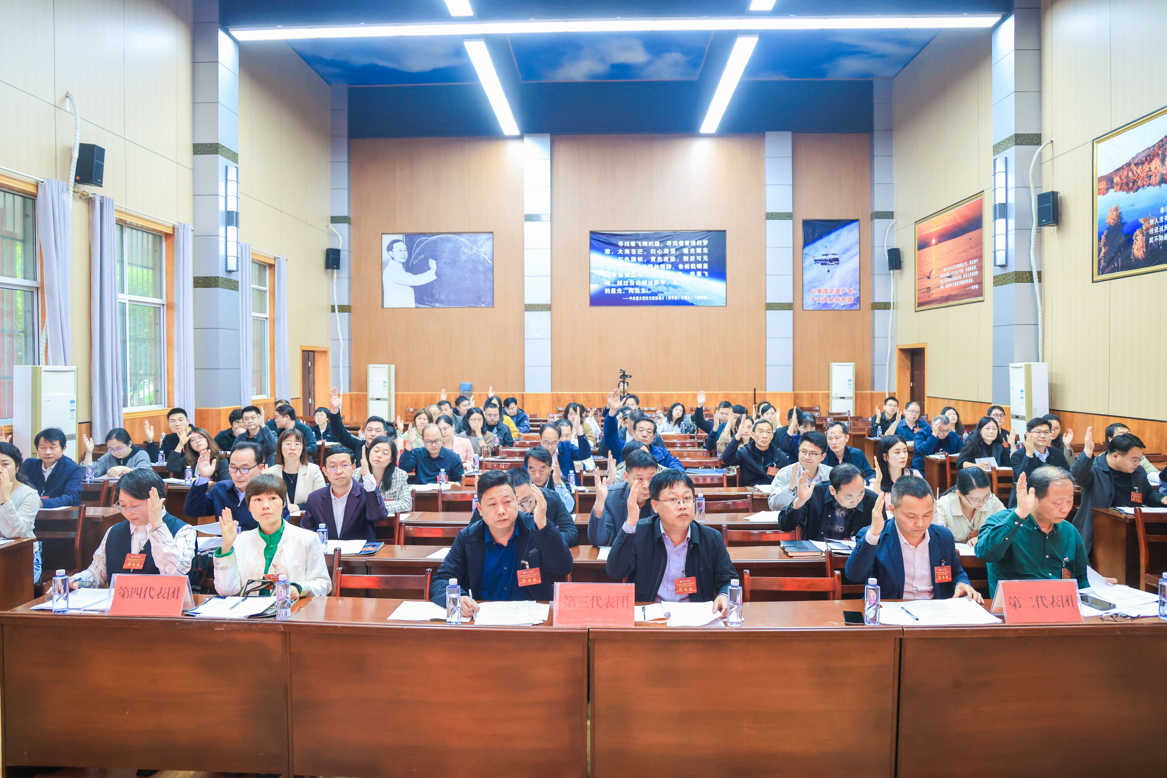 本网讯(通讯员 陈静 摄影 谈宇锋 郑景升)2026年4月12日至15日,我校召开第四届五次教职工代表大会暨工会会员代表大会。全体校领导,第四届教代会、工代会代表,学校各单位主要负责人齐聚一堂,共商发展大计,共绘奋进蓝图。校长余毅作学校工作报告,校党委书记江珩总结讲话,校党委副书记、副校长孔德文主持。