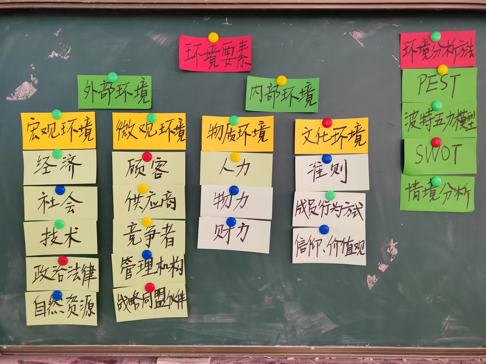 鲍老师在一次帮助孩子制作彩色卡片玩具时,发现彩色卡片色彩鲜艳,容易吸引注意力。她便有了将知识点写彩色卡片用于教学的想法。她根据课程章节知识点层次,应用了多种不同的颜色,将讲义内容要点提前记录在彩色卡片上,课前再有序贴在黑板上。卡片上的内容紧紧围绕这节课的知识点,层次分明,色彩亮丽,一下子就吸引了学生们的注意力。漂亮的卡片很快带动了课堂气氛,启发了学生学习兴趣,也加深了学生对重点知识的印象和理解。