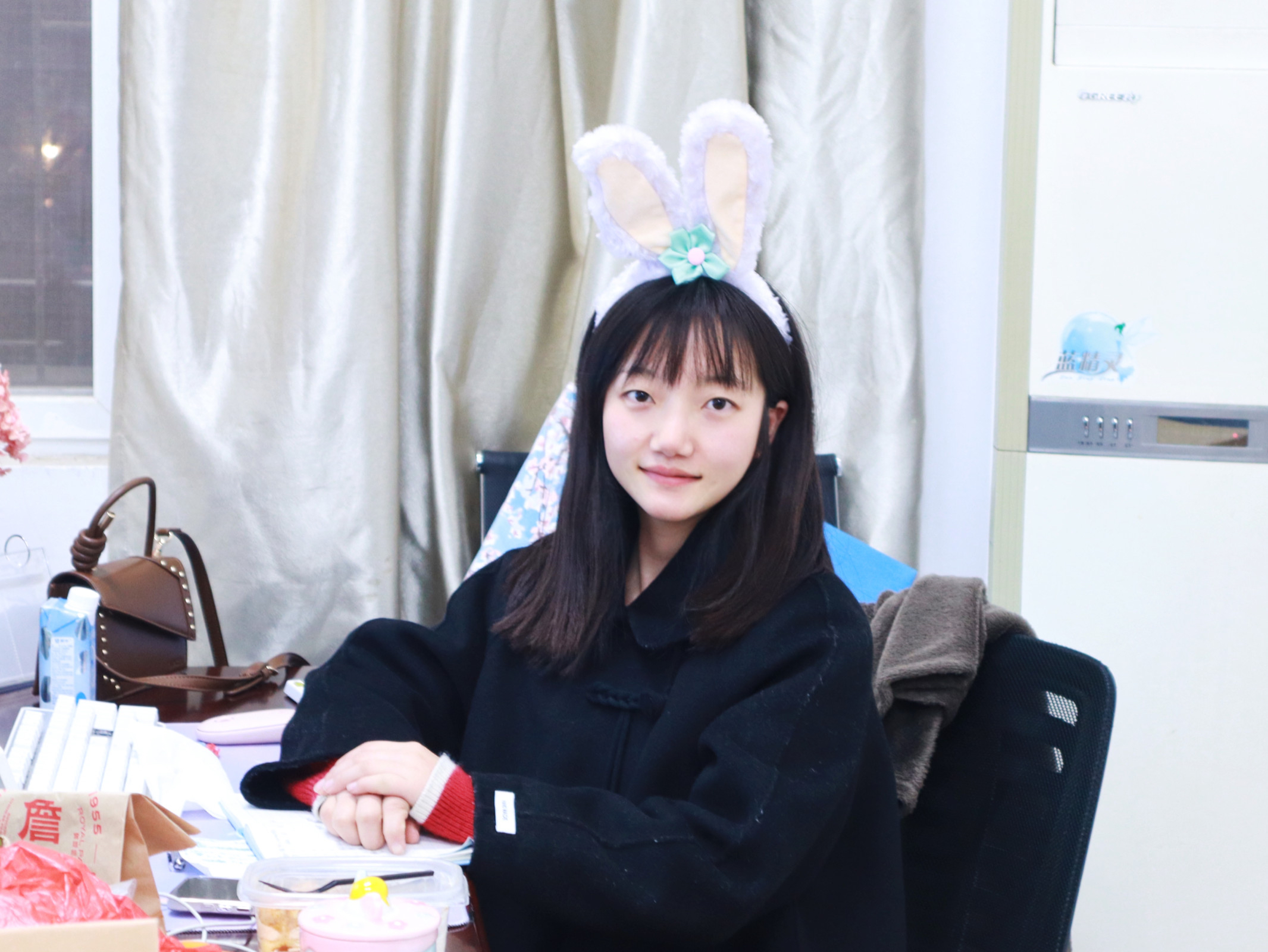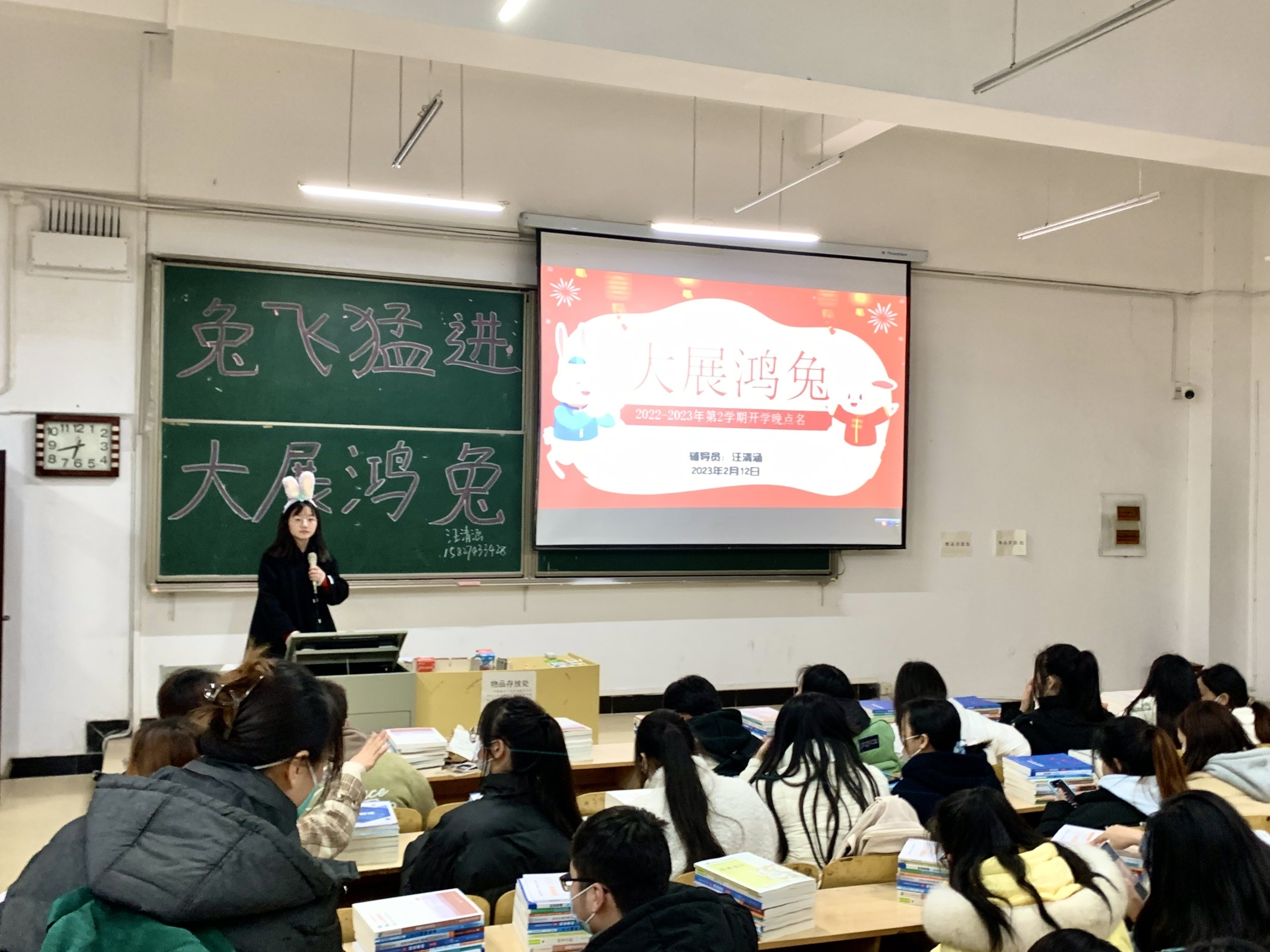 2022级大数据与财务管理的辅导员汪清涵则头戴可爱灵动的兔耳朵,向同学们表达了“‘兔’飞猛进”、“大展鸿‘兔’”的美好祝愿。“学生们都很乐观开朗,很可爱,我也不喜欢那种刻板和指责式的说教。我觉得这种方式更接地气,可以拉近跟他们的关系。今天的整个晚点名的气氛也是异常的欢乐和融洽,就像跟朋友一起谈心一样。”汪清涵如是说道。