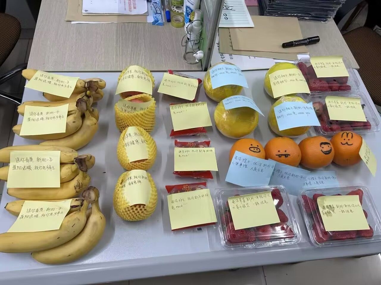 2022级大数据与财务管理专科二班的同学们在开学首场班会时就收到了来自辅导员黄敏准备的苹果、橙子、柚子、香蕉、草莓、柿子等代表美好寓意的水果。水果上贴着带有‘苹’安健康,奋发‘兔’强;心想事‘橙’,大展宏‘兔’;幸得‘柚’你,nice‘兔’meet you;‘蕉’阳送暖,‘兔’步青云;‘莓’开眼笑,一路坦‘兔’;新年好‘柿’‘兔’much 等祝福语的便签。