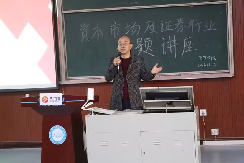 本网讯(通讯员 黄朝键)2023年3月1日下午16:00时,管理学院在东方红报告厅举办了资本市场及证券行业专题讲座。西南证劵有限公司湖北分公司万少智总经理主讲,金融工程、财务管理专业师生代表参加了本次讲座。讲座由院长助理朱水辉主持。