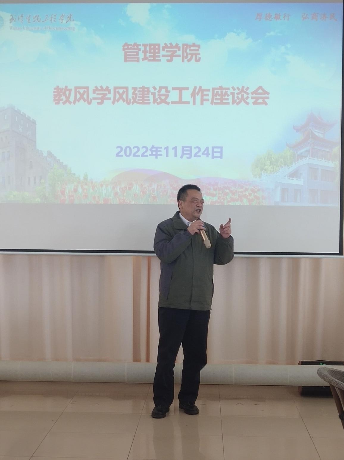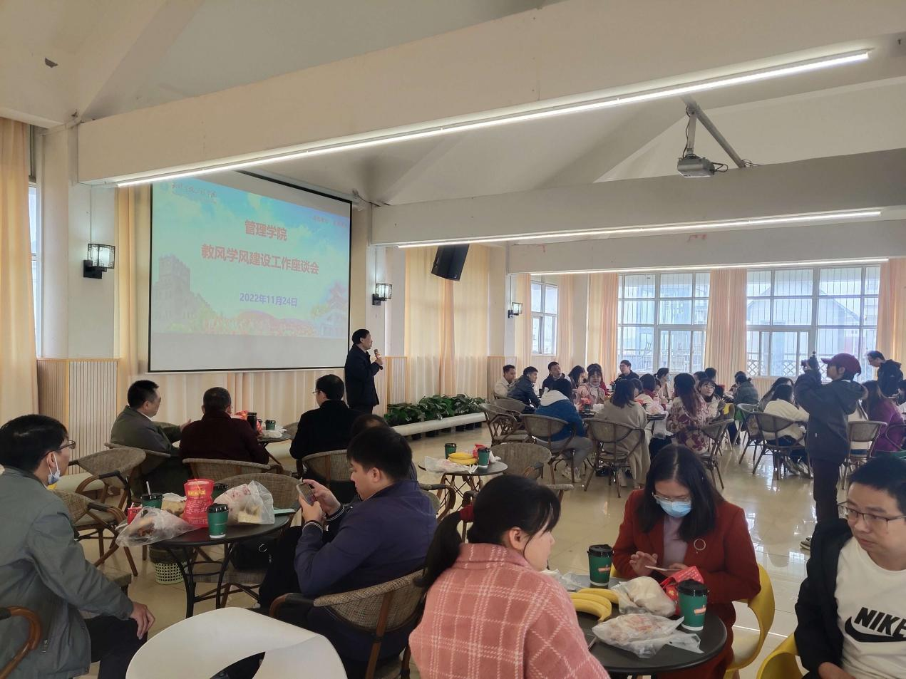 本网讯(通讯员崔浩冉摄影袁佳煊)11月24日中午,管理学院在学府楼金鼎教工俱乐部召开教风学风建设座谈会,校务委员会顾问赵正洲、管理学院全体教职工参加会议。座谈会由管理学院党总支常务副书记洪斌主持。