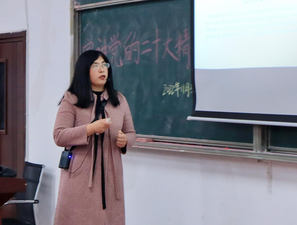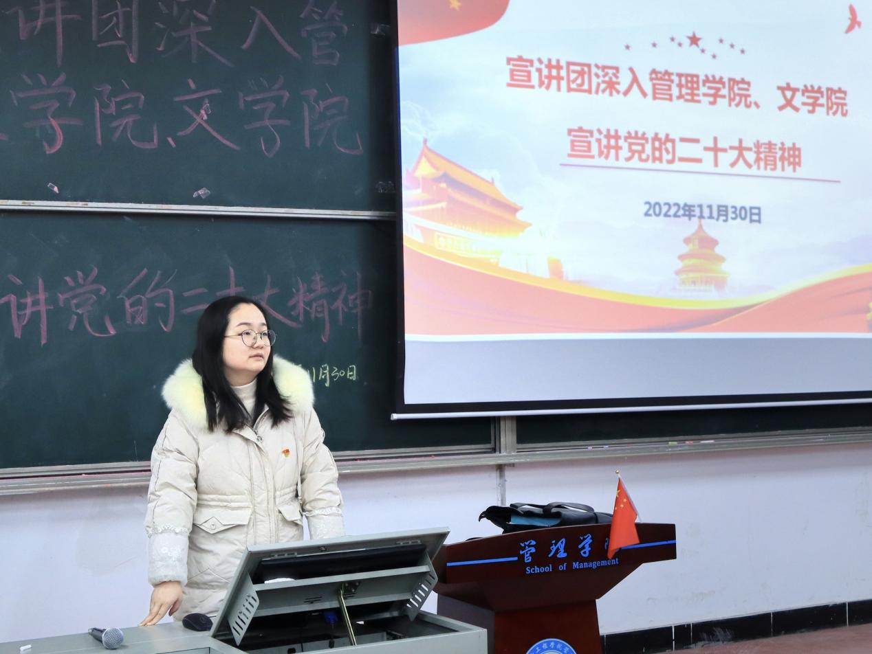 本网讯(通讯员陈雅欣摄影黄雅栋)11月30日下午,为了帮助学生深入学习二十大精神,巩固加强学生对党史知识的理解,管理学院在学府教学楼西方蓝报告厅召开“宣讲党的二十大精神”会议。文学院党支部发展对象、入党积极分子代表参加会议,会议由马克思主义学院专任教师陈红芳主讲。文学院党总支副书记袁宁主持会议。
