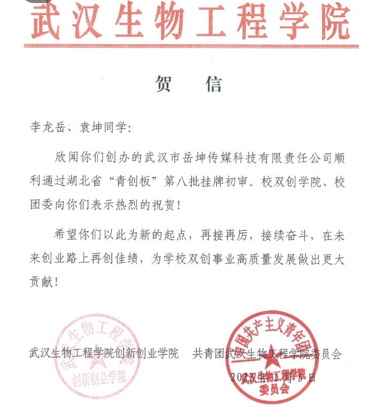 在创业中带来的不仅仅是金钱,更能获得待人处世的经验,以此来丰富自己的认识阅历。李龙岳和袁坤的创业故事激励我们大胆实践,不畏困难,“可以以失败收场,但一定不要无疾而终。”愿每一位创业者都能激昂青春,不负韶华!同时,祝贺李岳龙与袁坤创办的武汉市岳坤传媒科技有限责任公司顺利通过湖北省“青创板”第八批挂牌初审。