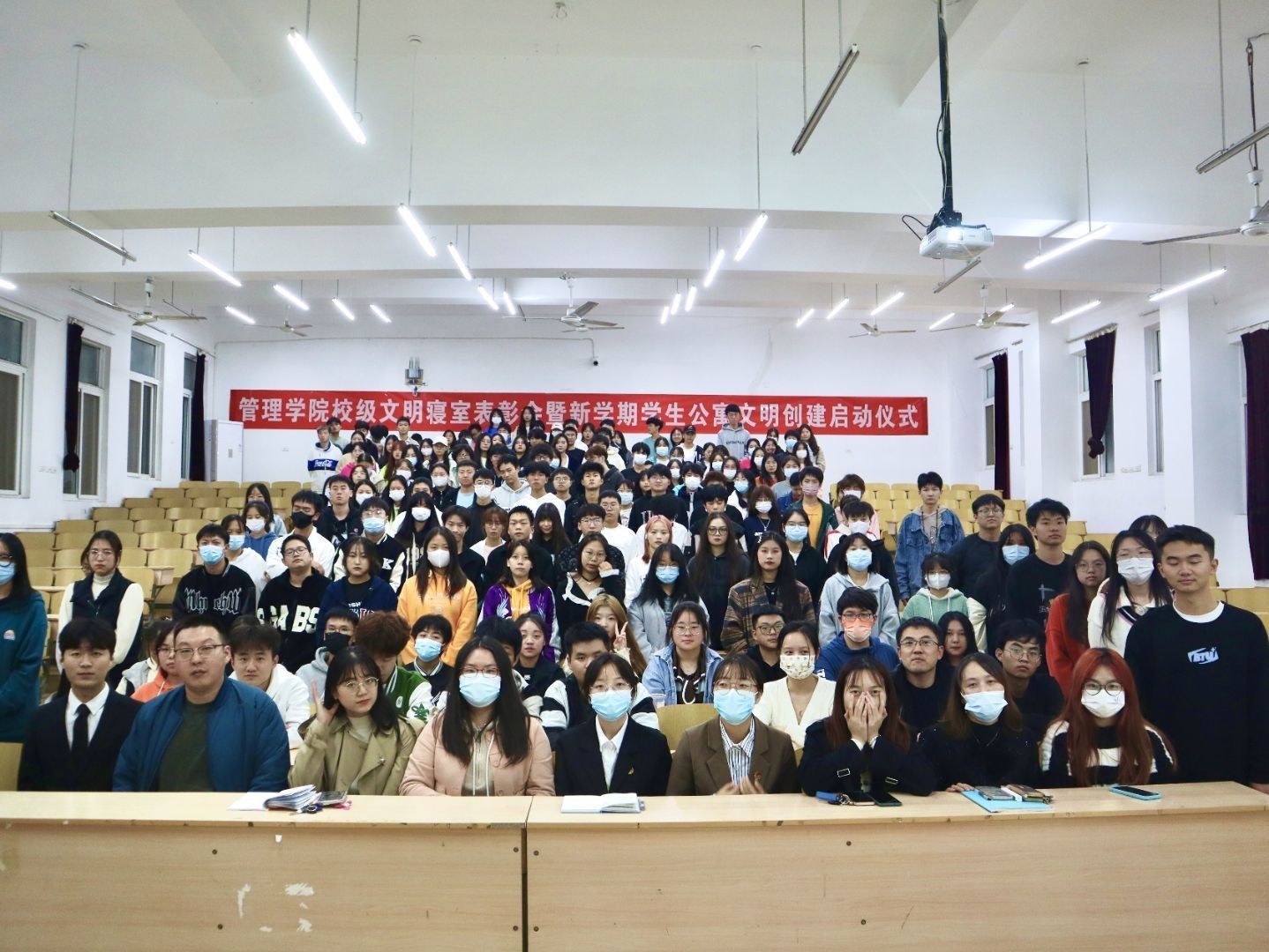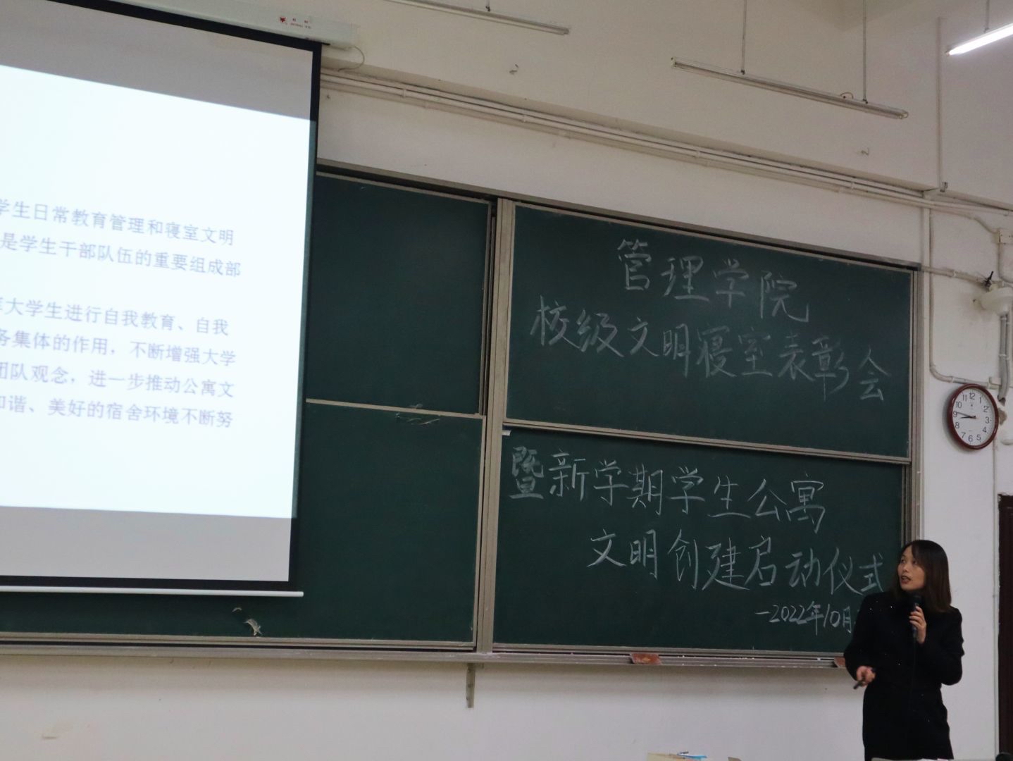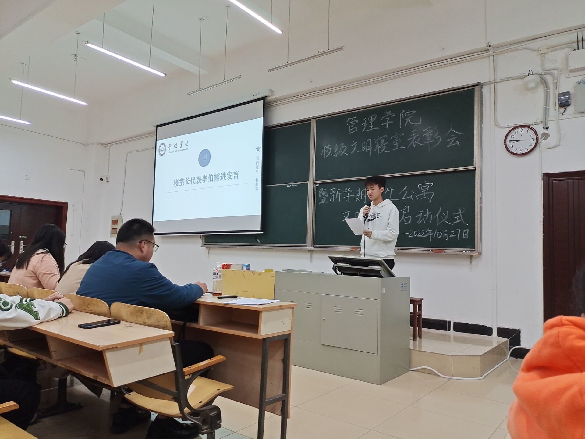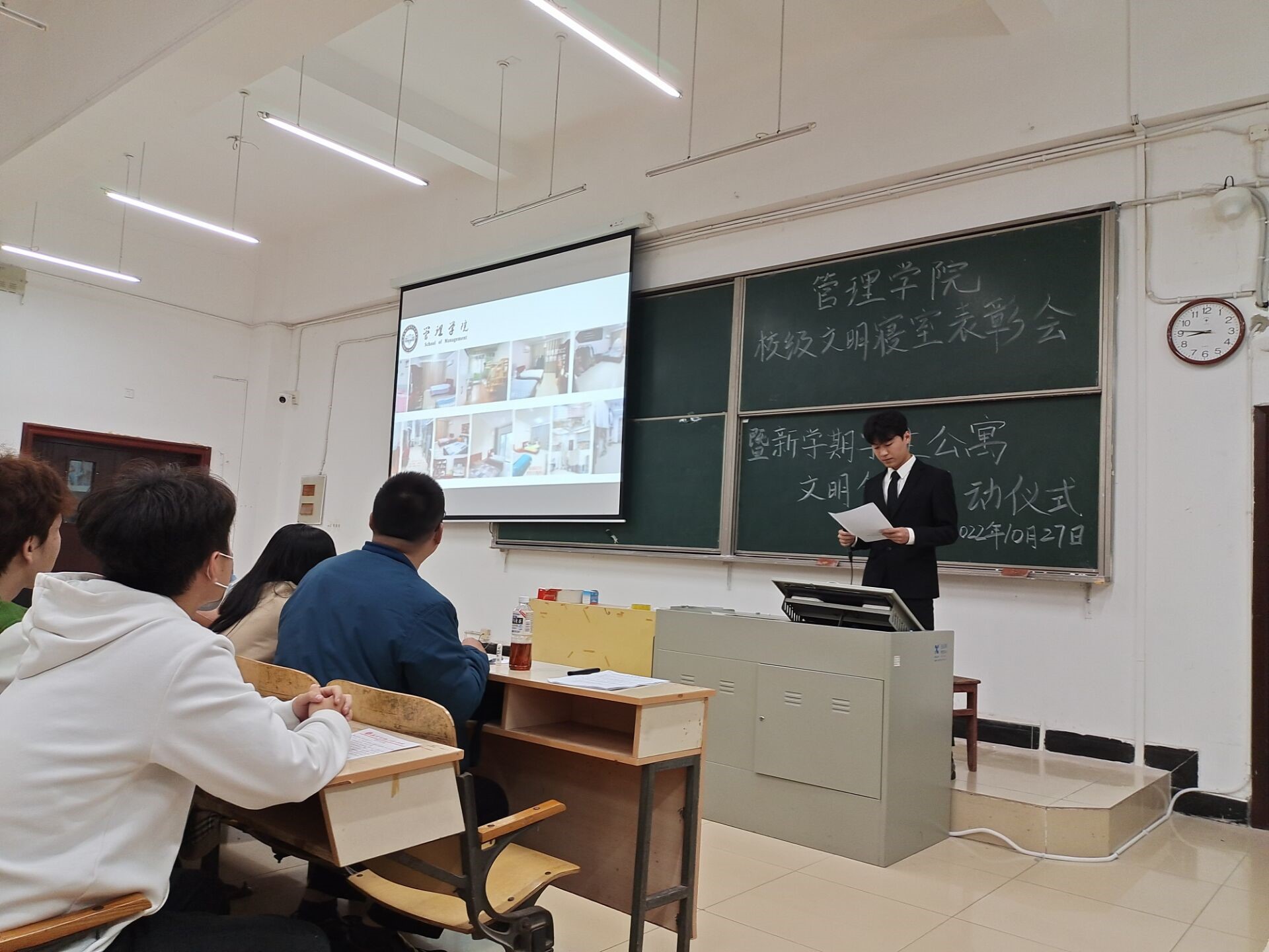 本网讯(通讯员 崔浩冉 摄影 杨若柳)10月27日晚,为全面贯彻落实湖北省教育厅关于加强高校文明寝室创建工作有关要求,进一步深化美育教育,打造更安全更舒适更温馨的寝室环境,管理学院在六号楼阶三教室举行校级文明寝室表彰暨本学期学生公寓文明创建启动仪式。管理学院党总支副书记邓桉树、组织员黄朝键、管理学院全体辅导员、获奖寝室成员、本学期全体生活委员及各班寝室长代表参加会议。大会由杨继豪主持。