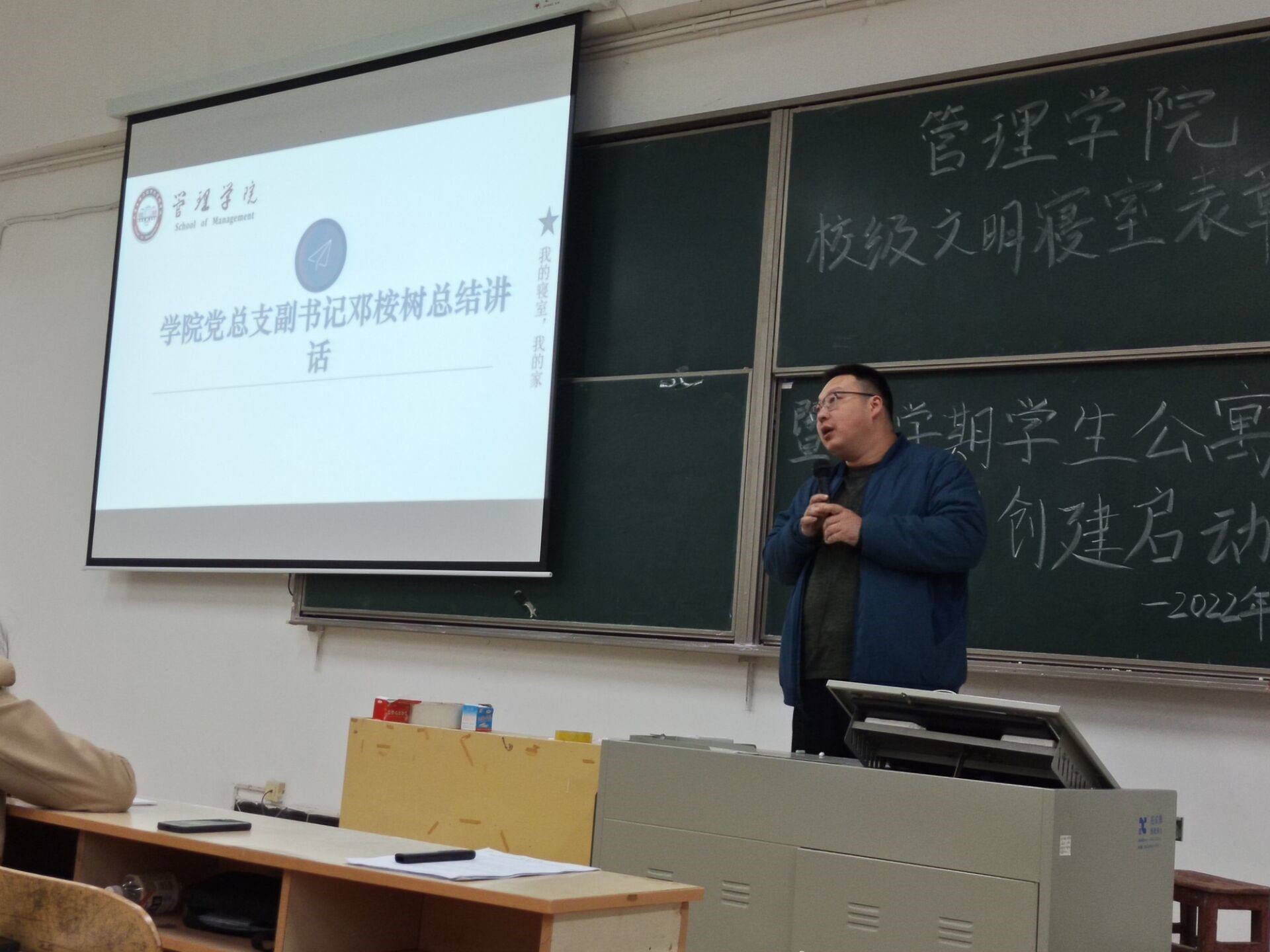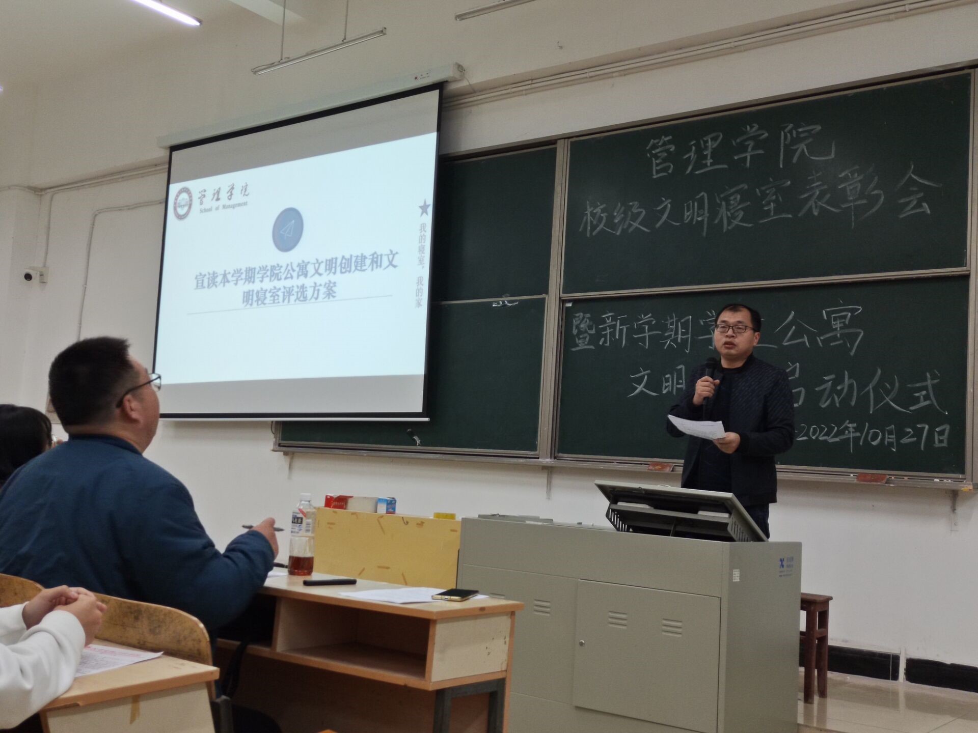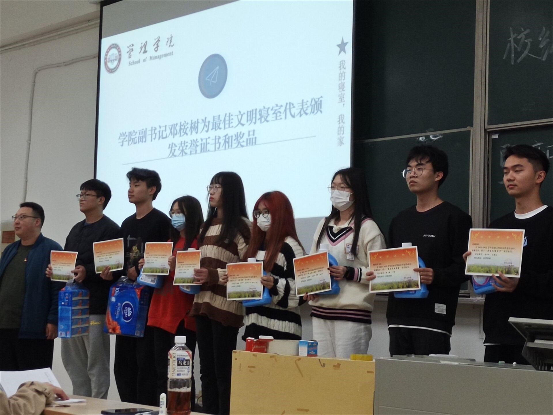 大会开始,杨继豪宣读表彰文件并由邓桉树、黄朝建为获奖寝室颁发奖状及奖品。