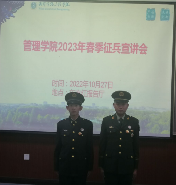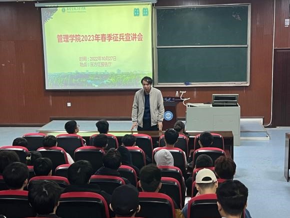 (本网讯 通讯员 晨曦)有志青年从军建功,热血男儿矢志报国。10月27日下午,管理学院联合校武装部在学府楼东方红报告厅举行2023年春季大学生应征入伍动员宣讲会。校武装部副部长卢旻出席本次活动,管理学院毕业年级师生代表参加会议。宣讲会由毕业年级负责人贾庆麟老师主持。