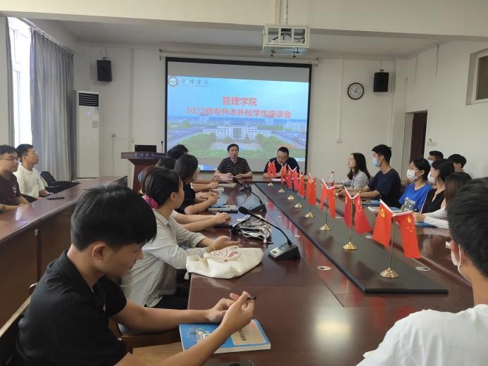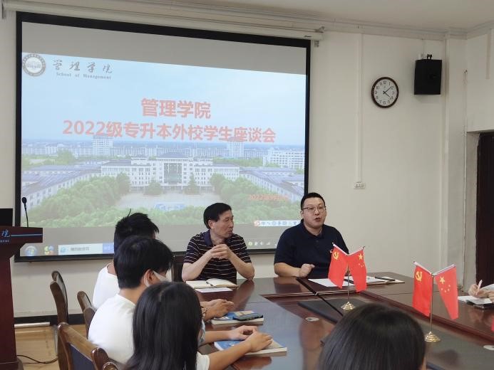 本网讯(通讯员 靖亚林 雷晋明)为表示对2022级专升本外校新生的热烈欢迎,引导他们正确规划大学生活并树立学习目标,听取外校新生在新校园新环境中遇到的困难和问题,让同学们能够更快更好地适应新的生活环境和学习氛围,我院于9月2日下午在6209会议室举行“新生活、新希望”2022级外校专升本学生座谈会。出席本次会议的有管理学院院长马敬桂、党总支常务副书记洪斌、副书记邓桉树、辅导员及专任教师代表、外校专升本学生。会议由学院副书记邓桉树主持。