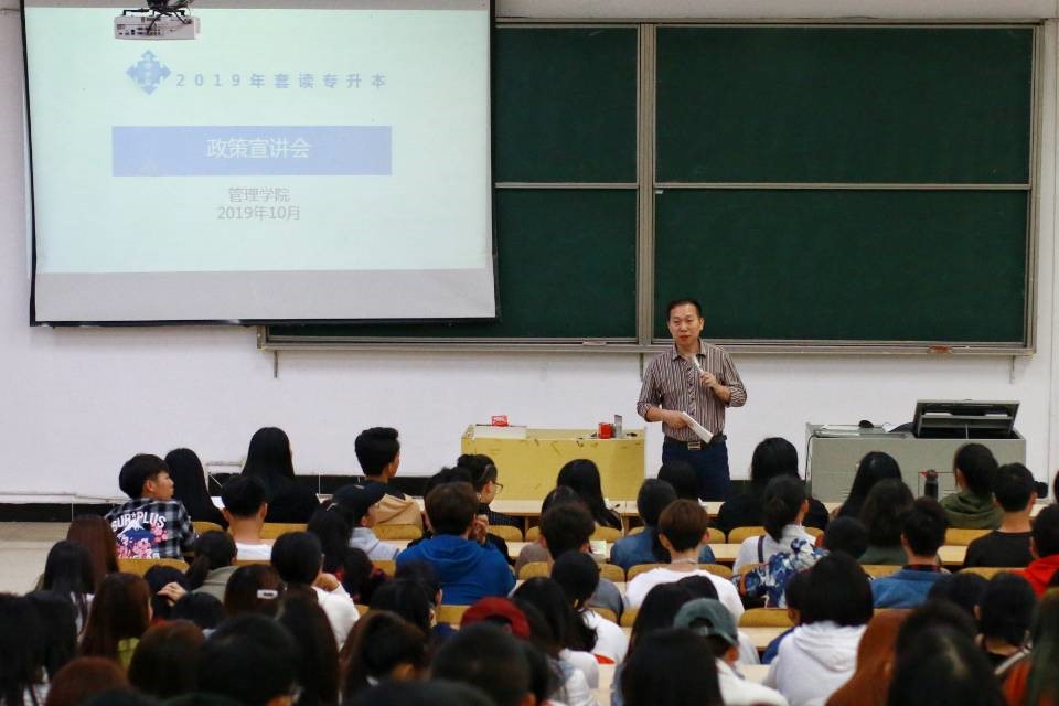 本网讯(通讯员 刘泽强 王枝 摄影 韩俊杰)10月11日下午,管理学院专本套读宣讲大会在六阶三召开。管理学院党总支常务副书记洪斌、继读教育学院院长李世兴出席会议,2017级财务管理专业专本套读学生代表张风雨以及2019级全体财务管理专科生参加。