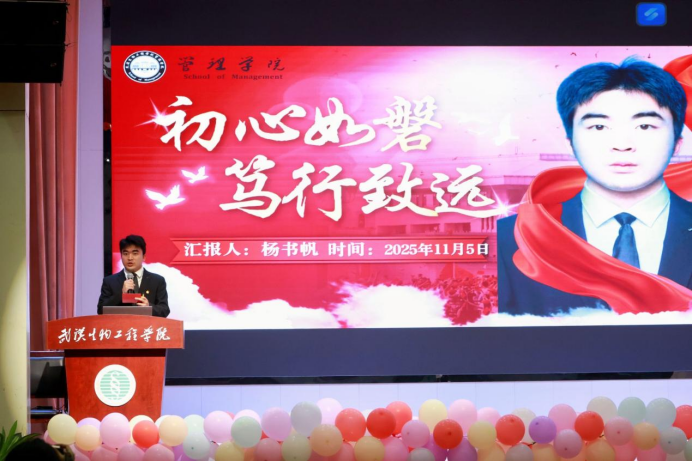 活动在艺术团活力四射的舞蹈《EiEi》中拉开帷幕。全体师生齐唱国歌后,学院党总支负责人秦辉致辞。他指出,本次活动是管理学院深化党建与育人融合的实践探索,更是一场面向全院师生的思想引领与成长赋能之旅。结合“青春与时代同频,成长与责任共振”的初心,秦辉强调党员身份意味着沉甸甸的责任,需以“知行合一”践行使命,号召青年学子将榜样力量转化为成长动能,并勉励2025级新生在大学关键期“敢闯会创”。