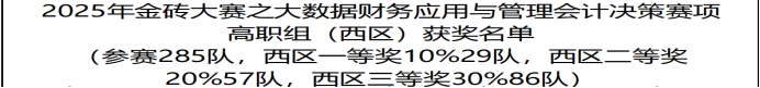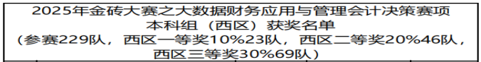 本网讯(通讯员 任丽)日前,2025一带一路暨金砖国家技能发展与技术创新大赛之“大数据财务应用与管理会计决策”赛项区域赛圆满结束。管理学院选派财务管理专业本科、高职各3支代表队参赛,在任丽、吕平安两位教师指导下,团队凭借扎实的专业功底、精准的数据分析能力与科学的决策思维突出重围,最终斩获本科组三等奖1项、优秀奖2项,高职组二等奖1项、三等奖1项、优秀奖1项。其中,高职组第二代表队成功晋级全国总决赛,充分彰显学院财经类专业人才培养的强劲实力。