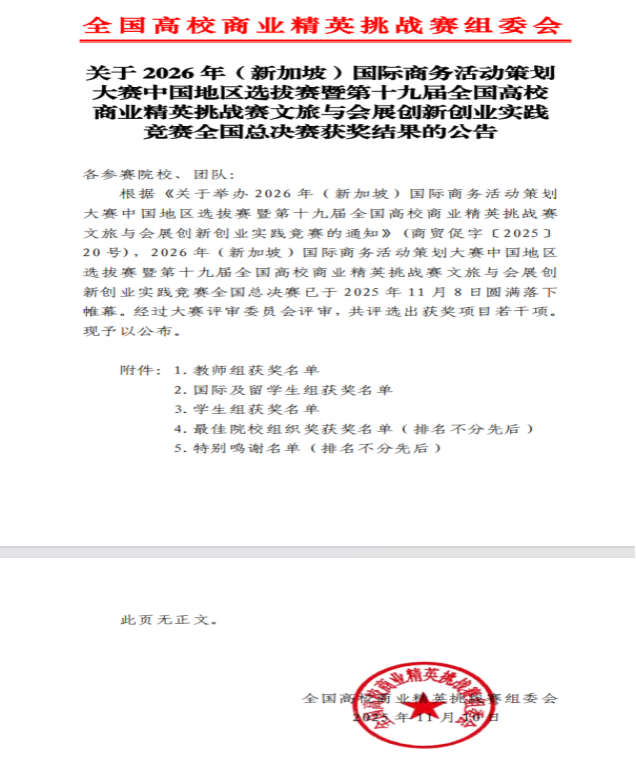 据悉,该赛事由中国国际贸易促进委员会商业行业委员会、中国国际商会商业行业商会、中国商业经济学会联合主办,连续五年入选教育部中国高等教育学会“全国普通高校大学生竞赛排行榜”,是文旅与会展领域层级高、覆盖广、认可度强的国家级学科竞赛,亦为我校立项的A类重点赛事。