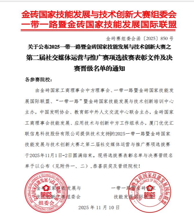 本网讯(通讯员 吴荣 窦星雅)日前,2025一带一路暨金砖大赛之第二届社交媒体运营与推广赛项选拔赛收官。管理学院市场营销专业6支团队参赛,在吴荣、窦星雅老师指导下,凭借扎实功底与实战化营销思维突围,斩获本科组二等奖2项、三等奖1项、优秀奖1项,高职组三等奖1项、优秀奖1项。其中1支本科队伍成功晋级全国总决赛,彰显我校市场营销专业实践育人成效。