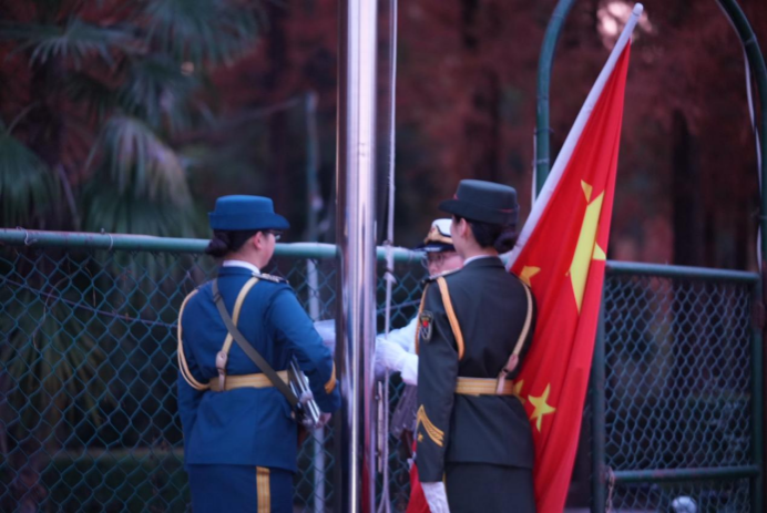 国旗护卫队迈着铿锵有力的步伐护送国旗入场。伴随雄壮的国歌声,鲜艳的五星红旗冉冉升起,全体师生肃立行注目礼。