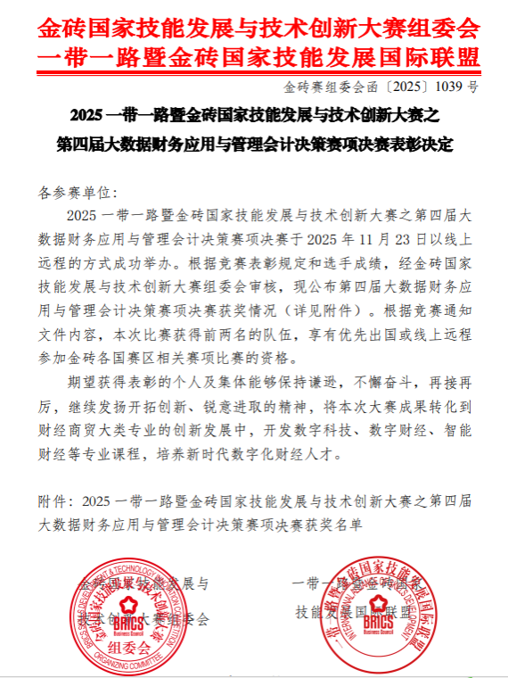 本网讯(通讯员 任丽 吕平安)11月23日,2025年一带一路暨金砖国家技能发展与技术创新大赛——第四届大数据财务应用与管理会计决策赛项全国总决赛落下帷幕。管理学院杨诗怡、佃汤琳、唐浩淼、黄智慧团队在任丽、吕平安老师指导下,凭借扎实的专业基础、默契的团队配合和出色的实战能力,从全国众多参赛队伍中突围,最终荣获高职组二等奖。指导老师获评“优秀指导老师”,学校获“优秀组织奖”,充分展现了学校在培养高素质技术技能人才方面的显著成效。