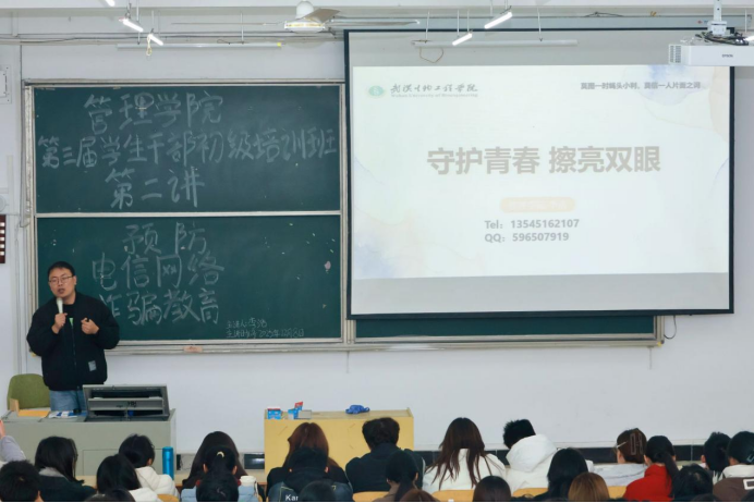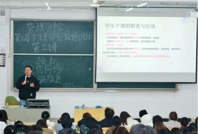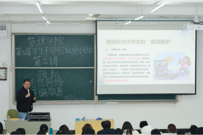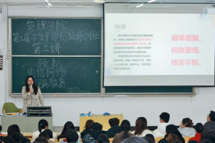 本网讯(通讯员 章宏杰 摄影 张冉)12月8日下午,管理学院利用第三届学生干部初级培训班,举办“预防电信网络诈骗教育”专题培训。辅导员李浩老师担任主讲,学院分团委书记黄敏出席活动,全体大一、大二年级学生骨干及学院社团负责人参加培训。