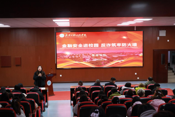 (拍摄 王亦宁 通讯员 章宏杰)为切实提升师生防范电信网络诈骗意识与能力,筑牢平安校园防线,3月10日下午,武汉生物工程学院管理学院在东方红报告厅举办反电信网络诈骗专题讲座。本次活动由管理学院党总支副书记淳再清主持,中国银行新洲支行副行长汪礼涛主讲,学院全体辅导员及非毕业班班长、团支书、宣传委员、社团骨干学生参会。