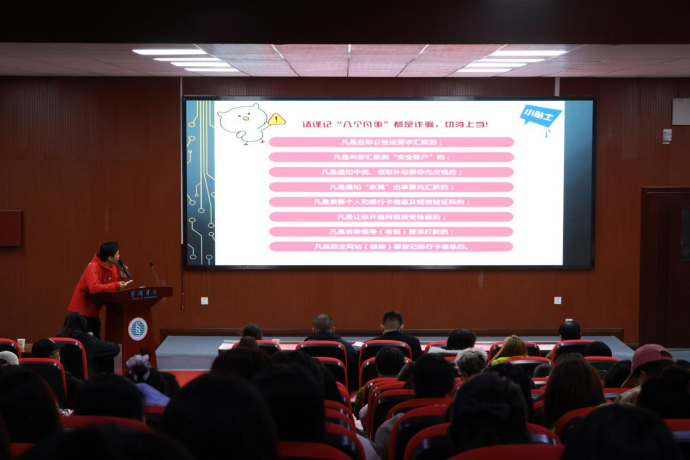 淳再清在开场致辞中强调,当前电信网络诈骗呈现高发性、受害人群年轻化等特征,学生群体已成为重点侵害对象,开展本次讲座是守护师生财产安全、推进平安校园建设的重要举措。他要求全体参会人员认真学习反诈知识,将防范技巧传递给身边亲友,切实提升自我保护能力。