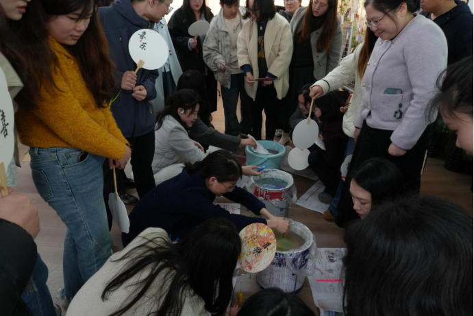 生日会的温情余韵未尽,“漆韵润心,扇舞芳华”非遗漆扇文化体验,带领老师们走进非遗技艺的世界。旅游管理教研室孙兴美老师率先带来专业讲解,用15分钟的时间,细致介绍漆扇的起源与发展历程、深厚的文化内涵,以及核心制作工艺,让老师们对这一传统非遗技艺有了全面且深入的了解。随后进入2动手创作环节,老师们化身非遗匠人,静下心来构思图案、调配颜料,一笔一画在扇面上精心绘制,沉浸式体验漆扇制作的乐趣。创作完成后,老师们纷纷手持自己的匠心之作展示交流,集体合影留念,用镜头定格非遗之美与欢聚时刻。