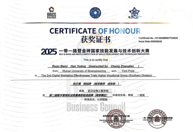 在学科竞赛方面,师生参加省级以上专业竞赛,57人次获一等奖,83人次获等级奖。在2023年,营销专业学生李龙岳、袁坤的创业项目获中国国际大学生创新大赛铜奖。2025年,营销专业学生阮贝霓、韩钰婷参加第二届数字营销实战竞赛(南部赛区)获得一等奖。