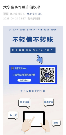 走访学生宿舍面谈,反诈防骗宣传教育走深走实。学院全体辅导员不仅充分利用QQ、微信公众号等平台在各班级群中密集发布日常防诈骗安全提示,也经常深入学生宿舍,点对点宣传防诈骗小技巧。学院新媒体矩阵广泛转发《大学生防诈反诈倡议书》、《警惕!新型诈骗怎么防?》等相关推文,开辟多种途径,拓宽宣传渠道,师生共同筑牢反诈防线。
