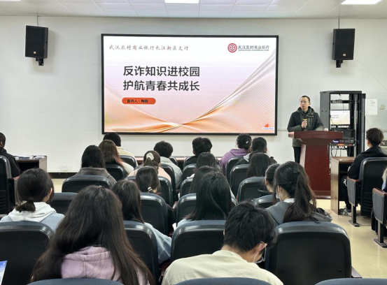 本网讯(通讯员 余玲)为做好防范电信网络诈骗宣教工作,提升师生防范电信网络诈骗意识和能力,切实维护广大师生的切身利益,3月27日下午,我院特别邀请武汉农村商业银行长江新区支行的陶雨经理,为学院师生开展“反诈知识进校园,护航青春共成长”为主题的反诈宣讲活动。