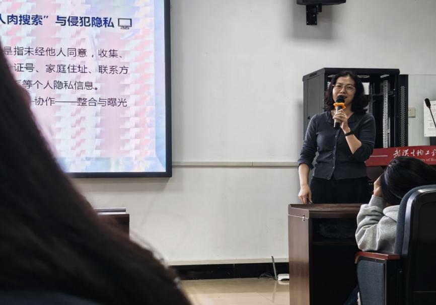 本次主题讲座围绕网络谣言甄别、个人信息保护、知识产权捍卫、网络诈骗规避等大学生网络生活热点展开。赵磊老师和柏林惠老师以近期热点网络案例为切入点,深入解析“人肉搜索”“恶意P图”“煽动对立”等高频网络行为的法律红线与严重后果,让同学们直观感受到网络法治的严肃性。赵老师和柏老师结合《网络安全法》《个人信息保护法》等法律法规,用“校园网贷陷阱中的信息泄露风险”“学术论文抄袭的版权追责”等贴近学生生活的案例,将抽象的法律条文转化为生动的现实警示。从案例分析到法条解读,从风险提示到维权指引,讲座内容层层递进,为同学们构建起系统的网络法治知识体系。