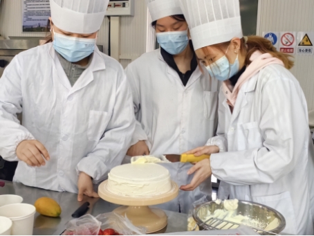 活动前期,同学们在烘焙实训室精心筹备,依托专业所学,在老师指导下分工协作,从称量配料、打发奶油到烘烤裱花,每一步严谨细致。两小时后,奶香浓郁、造型精致的手工蛋糕新鲜出炉,为阳春宴席注入甜蜜暖意,也让专业知识在实践中落地生根。