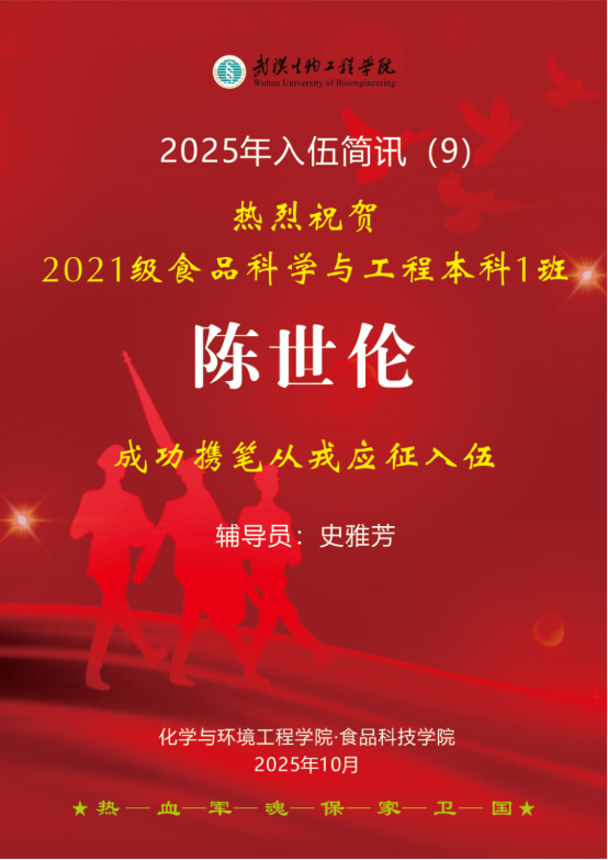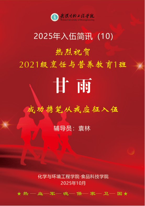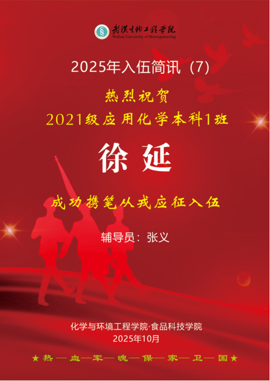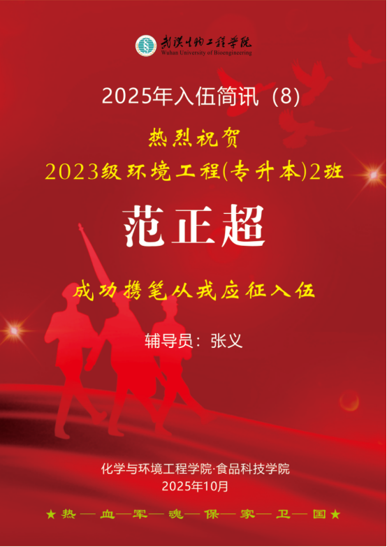 2025年,我院学子参军报国热情持续高涨。截至10月10日,我院又有4名学子响应祖国召唤,光荣应征入伍,奔赴军营淬炼成长、奉献青春,为全院青年学子树立了榜样。