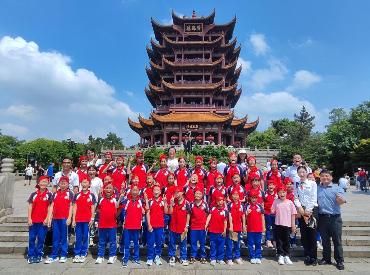 小朋友在工作人员带领下在黄鹤楼前打卡