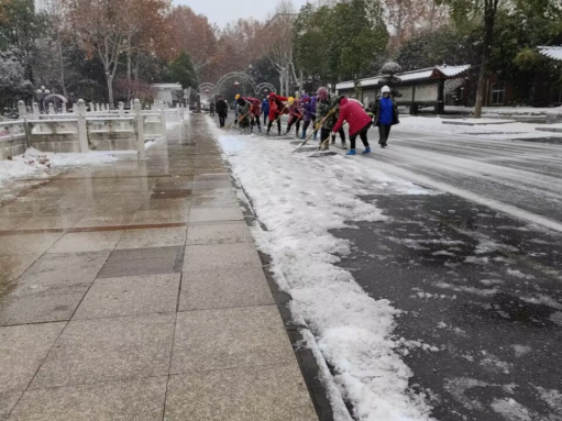 环卫部率先行动,组织员工对晨光路中段(长青楼)至长河港湾西门路段、接待中心门前等关键区域进行集中清雪。寒风凛冽中,大家挥锹铲雪、奋力清扫,争分夺秒打通教工就餐、通勤的核心通道,以实际行动守护校园“平安路”。