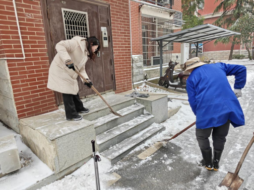 物业中心同步启动应急响应,坚持“雪停即清、随清随保”。各教学楼管理员及时清理楼栋入口及台阶积雪,铺设防滑垫;长河港湾物业人员迅速清扫各单元门前通道,并贴心提醒住户注意防滑,将温暖服务延伸到教工家门口。