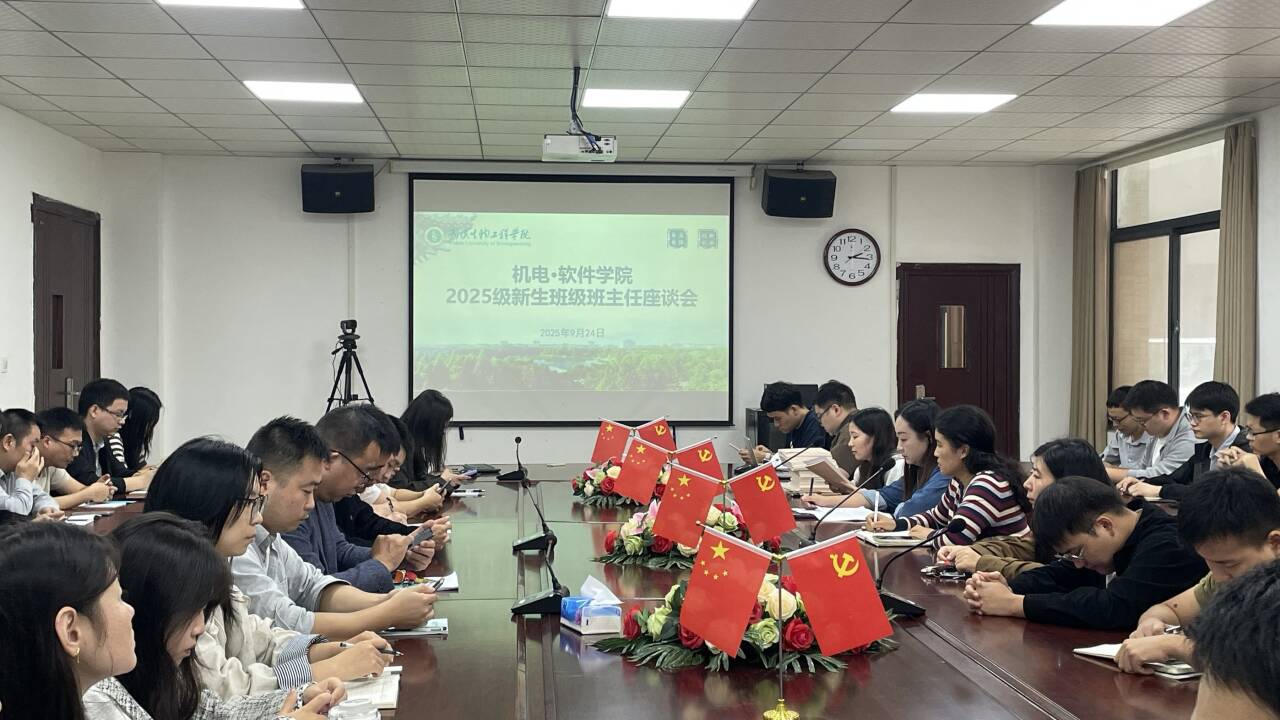 本网讯(通讯员 淳再清 摄影 陈雅兰)为全面落实“立德树人”根本任务,加强新生班主任队伍建设,确保2025级新生教育管理工作开好局、起好步,机电·软件学院于2025年9月24日下午在16号教学楼207会议室成功举办了2025级新生班主任座谈会。学院党总支书记宋颖颖、全体新生辅导员、班主任共同参与,本次座谈会由学院党总支副书记淳再清主持。