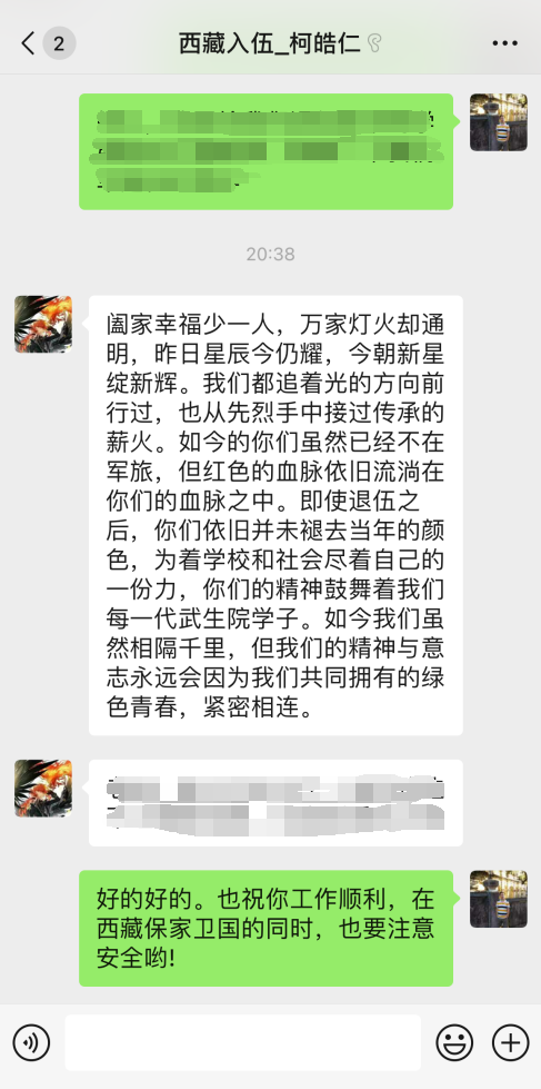5月4日下午,柯皓仁所在部队收到了来自母校计科学院的慰问信,执勤结束后,柯皓仁迫不及待地打开慰问信阅读,并通过手机与学院党总支副书记陈龙老师取得联系,在交流中,他得知学院不久前刚成立了“问天军迷社”,柯皓仁心中涌动着一种心潮澎湃的信仰力量。在短暂的交流即将结束时,他用手机给“问天军迷社”的同学发来一则短信:“阖家幸福少一人,万家灯火却通明,昨日星辰今仍耀,今朝新星绽新辉。我们都追着光的方向前行过,也从先烈手中接过传承的薪火。如今的你们虽然已经不在军旅,但红色的血脉依旧流淌在你们的血脉之中。即使退伍之后,你们依旧并未褪去当年的颜色,为着学校和社会尽着自己的一份力,你们的精神鼓舞着我们每一代武生院学子。如今我们虽然相隔千里,但我们的精神与意志永远会因为我们共同拥有的绿色青春,紧密相连。”