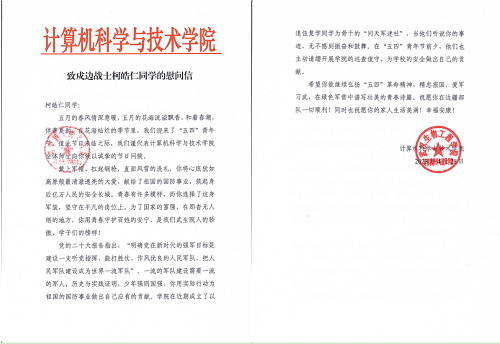 本网讯(通讯员 邓甜)一封信、一份快递,承载了武汉生物工程学院计算机科学与技术学院对远赴祖国边疆西藏山南区戍守学子的慰问与祝福。五四青年节前夕,计科学院发去了对戍边战士柯皓仁同学的慰问信,信中对柯皓仁同学戍守边疆的勇气与决心表示钦佩与赞赏,同时也表达了学院对他的殷切期望与深切祝福。