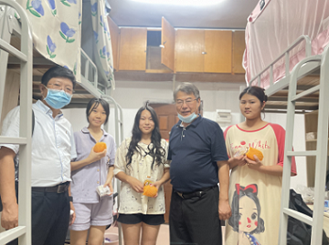 每走近一间宿舍,顾校长对新生们表示热烈地欢迎,亲切地询问同学们来自哪里,对宿舍的环境是否满意,是否向家长报了平安?他说,今天是同学们正式报到的第一天,十五的月亮,让我们在十六“缘”了起来。正值中秋假期,顾豪爽为四季苑2022级新生赠送月饼、水果等礼物,与同学们共享佳节欢乐。在与同学们的交流中,他鼓励同学们做好人生规划及大学规划,以学业为主线,以全面发展为目标,立雄心,抒壮志,以实干绘就人生蓝图,成就自己精彩的人生。