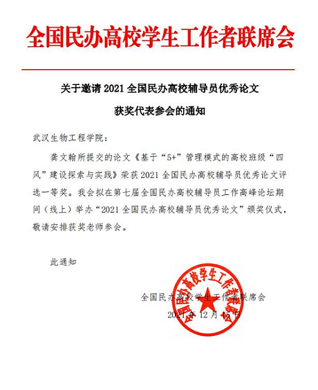 本网讯 在2021全国民办高校辅导员优秀论文评选中,我院辅导员龚文翰所提交的论文《基于“5+”管理模式的高校班级“四风”建设探索与实践》荣获优秀论文一等奖。
