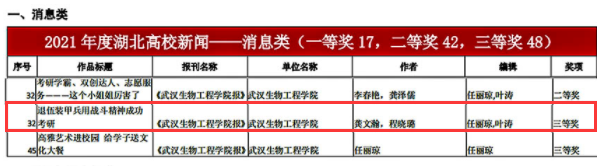 本网讯(通讯员 谨之)3月8日,2021年度湖北省高校新闻奖评选结果揭晓,我院龚文翰与党委宣传部·校新媒体中心程晓璐共同撰稿作品《退伍装甲兵用战斗精神成功考研》获消息类三等奖。