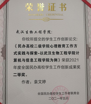 图为我院辅导员袁文婷老师的论文《民办高校二级学院心理教育工作方式实践与探索-以武汉生物工程学院计算机与信息工程学院为例》喜获二等奖