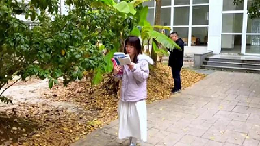 图为靳婵婵在图书馆内露天小院备战考研