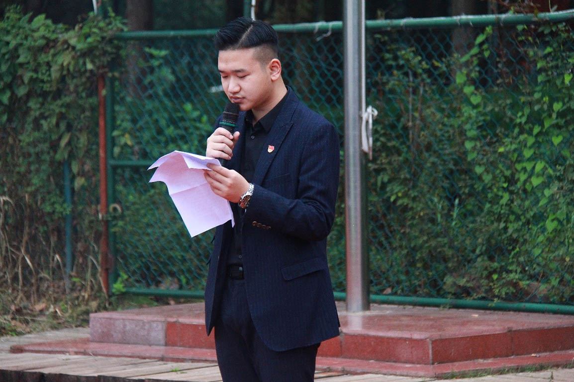 礼毕后,学生代表龚泽儒发言。龚同学以实际行动告诉我们,从疫情斗争胜利到学子返校、从压不跨的中华民族到返校后遵纪守规的学生,青年大学生的身份变化,意味着将个人理想主动融入国家发展大业;同时也是发出了内心的最强音:国家前途,民族希望,青年大学生正在努力挑在肩上!